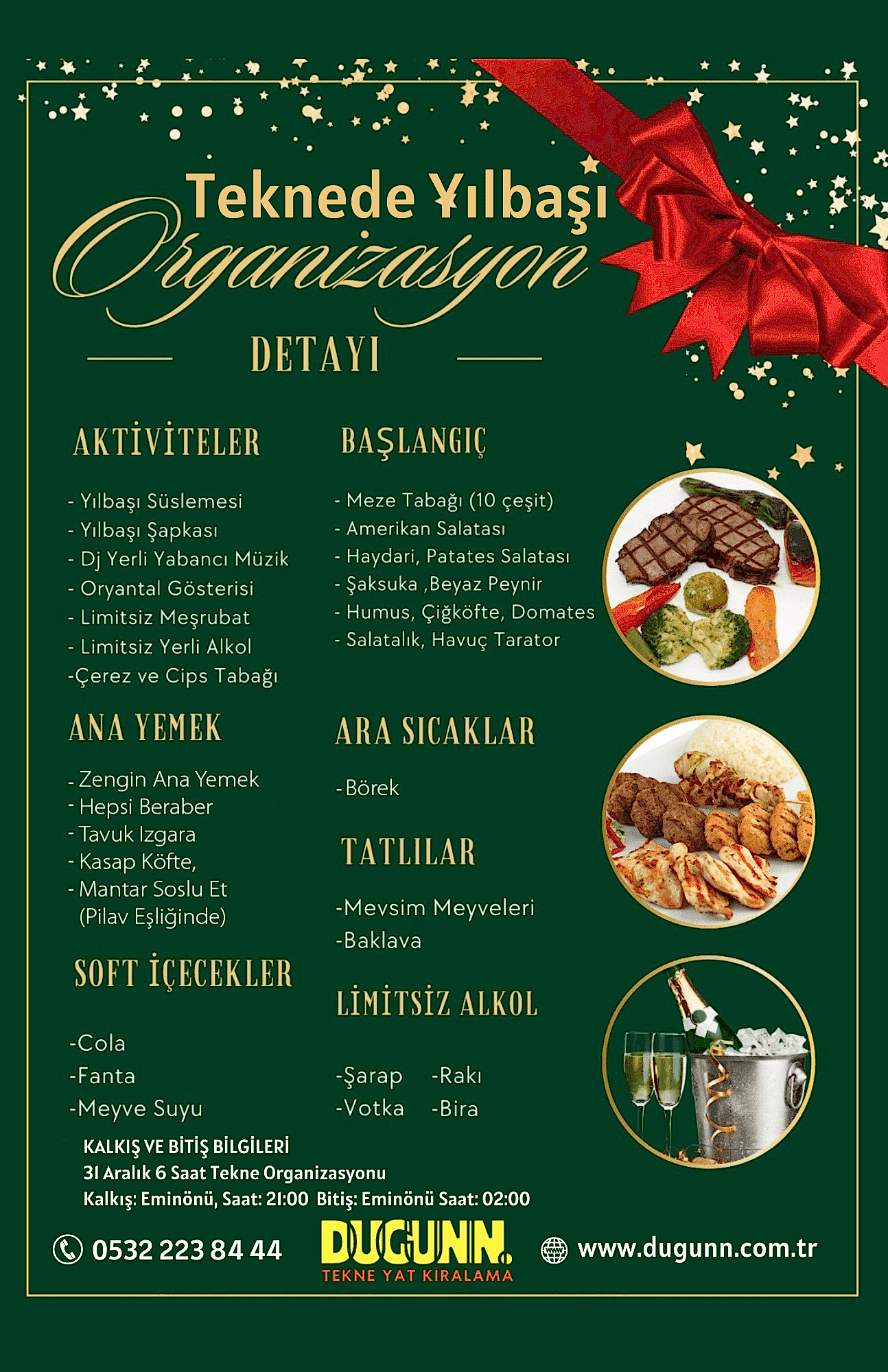 Siz de bu yıl farklı bir deneyim yaşamak isterseniz, hemen Teknede Yılbaşı Partisi rezervasyonunuzu yaptırın ve yeni yıla harika bir başlangıç yapın!